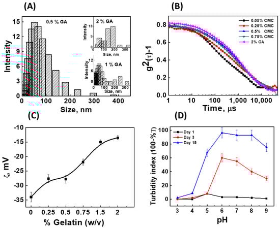 Plot (A) shows the intensity distribution of varying concentrations of GA. Plot (B) shows the correlation decay in the light scattering intensity of 2% GA in the absence and presence of different concentrations of CMC (0.05–0.75%). Plot (C) shows the variation in the zeta potential of the CMC solution when adding different amounts of GA (0–2%). Plot (D) shows how the turbidity index varies the pH of the solution.