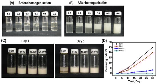 Photographs of the colloidal particles before (A) and after (B) homogenization with different (0.1–0.6) weight fractions of coconut oil. Plot (C) shows photographs of the emulsion prepared from 0.6 volume fraction coconut oil, under varying homogenization speeds (2500–26,000 rpm) on day 1 and day 5. Plot (D) shows the rates of the formation of the creamy layer in the emulsion prepared at different homogenization speeds.