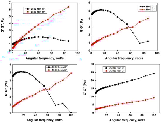 The emulsions prepared at a volume fraction of 0.6 did not show any phase separation into cream and serum, suggesting higher levels of stability. Therefore, it was inferred that the 0.6 volume fraction of coconut oil was ideal for the preparation of the stable emulsion. The strength of the sheer force applied during the preparation of the emulsion also plays a significant role in its stability. Therefore, to study the effect of the speed of homogenization on the stability of th Pickering emulsion, the volume fraction of coconut oil in the water was fixed at 0.6, and the speed of homogenization varied from 2500 rpm to 26,000 rpm. Figure 2C shows the respective photos of the homogeneity of the emulsion at varying homogenization speeds (2500–26,000 rpm) on the first and the fifth day following synthesis. Visually, it can be inferred that the speed of homogenization had a strong influence on the stability of the emulsion. The emulsions prepared at 2500 to 8500 rpm were not stable until the fifth day, as the phase separation into cream and serum could be clearly seen on the fifth day, whereas the emulsion prepared at 16,000–26,000 rpm showed little to no phase separation on the fifth day. Supporting this, Figure 2D shows the creaming index of emulsions at different homogenization speeds as a function of time (30 days). It can be clearly seen that the creaming index of the emulsions prepared at 2500 to 8500 rpm increased as the days passed. On the other hand, emulsions prepared at 16,000 to 26,000 rpm did not show any significant increase in the creaming index after up to 30 days of preparation, suggesting better stability. Furthermore, to corroborate the above results, the stability of the as-synthesized Pickering emulsions was also monitored in terms of viscoelastic parameters, such as G′ and G″, through the rheometric studies [41,42]. In order to determine the G′ and G″, the emulsions were subjected to deformation in a frequency sweep at a given strain of 1%. The intersection or crossover of G′ and G″ is indicative of the instability of the gel [41,42]. The dynamic frequency sweep test indicated that the emulsions prepared at 2500, 8500, and 16,000 rpm exhibited G′ > G″ at lower frequencies, and the cross over at higher frequencies (Figure 3).