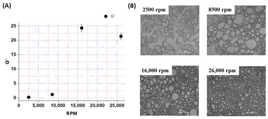 (A) Plot of storage modulus (G′) at the start of the frequency sweep against the homogenization speed. Plot (B) shows the optical images of the emulsion microstructure obtained at different speeds of homogenization, as observed under the microscope (Magnification 10×).