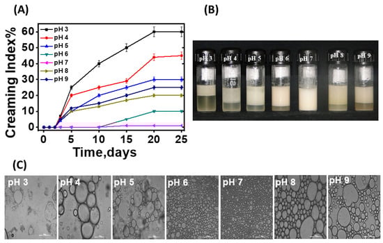 (A) Plot shows the rate of the formation of the creamy layer in the emulsion prepared at different pHs. (B) Photographs of the emulsions prepared at different pHs on day 5. (C) Optical images of the emulsion microstructure, obtained at different pHs as observed under a microscope (Magnification 10×).