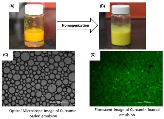 Photographs of curcumin loaded in the emulsion (A) before and (B) after homogenization. Images (C,D) represent the image of the curcumin-loaded emulsion under (C) an optical microscope and (D) a fluorscence microscope (Magnification 20×).