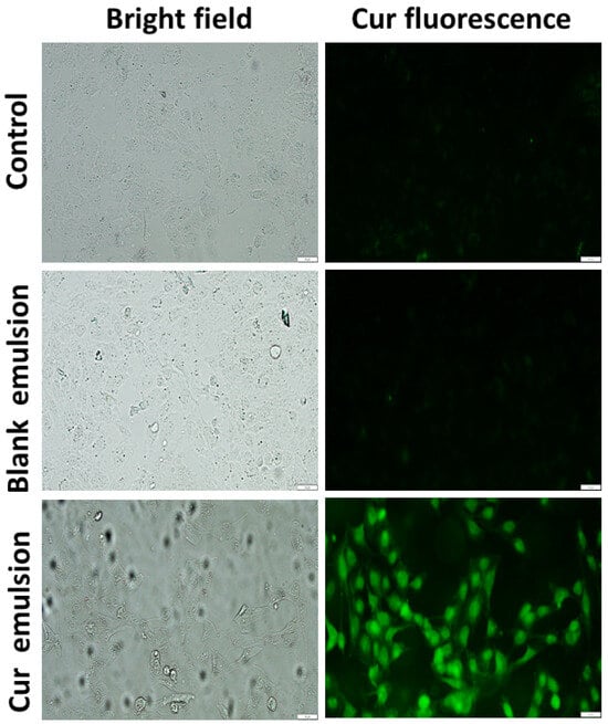 The figure shows the representative bright field and fluorescence images of WI26 cells treated with 25 µM curcumin equivalent of blank and curcumin-loaded GA-CMC stabilized Pickering emulsions. The cells were treated with the formulations for 6 h. The fluorescence images were captured using the IX83 (Olympus) microscope following excitation, using a band pass fluorescence filter set of FITC. Control represents untreated cells. The magnification was 20×.