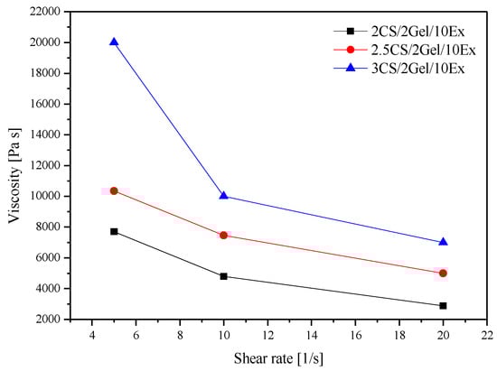 Therefore, the three newly formed formulations were initially tested for their viscosity through rheological measurements via increasing the shear rate (Figure 1). It is observed that the increase in the CS concentration in the hydrogels leads to an increase in the viscosity values (Figure 1). This happens due to the increase in the intensity of electrostatic interactions of the positively charged amino groups as the CS macromolecular chain is highly stretched in an acidic environment [31]. Based on the above values, formulations 2CS/2Gel/10Ex and 2.5CS/2Gel/10Ex meet the viscosity requirements [30].