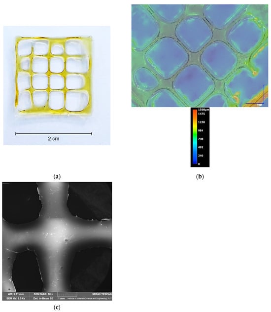 Based on the microscopic image (Figure 2), it is clearly visible that the shape of the print is uniform, and extrusion of the 2.5CS/2Gel/10Ex (P2) hydrogel produces an equal-sized square-shaped mesh scaffold as described above. At the same time, the uniformity of the thickness of the produced dressing is noticeable. The average thickness of the scaffolds in the interior, excluding the outermost line, was within the range of 620–750 μm (Figure 2b). Furthermore, SEM micrographs (Figure 2c) show the microstructure and morphology of the printed scaffolds. In the case of manufactured samples, their surface is smooth, which confirms the correctness of the process.