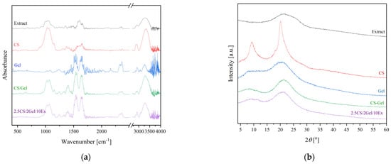 The 2.5CS/2Gel/10Ex scaffolds were further analyzed using XRPD measurements (Figure 3b). The behavior of the extract, demonstrating a substantial broadening of diffraction peaks, which at low intensity implies its amorphousness, was the same for Gel, while CS is a semi-crystalline polysaccharide with two characteristic peaks at 10 and 20° [33]. There was a decrease in the intensity of the CS peaks when testing 2.5CS/2Gel/10Ex. This may happen due to the interactions of CS/Gel mixtures caused by electrostatic interactions and hydrogen bonds as previously reported [34]. It seems that the addition of gelatin in chitosan solutions promotes the amorphous structure of the polymers and hinders crystallization of chitosan. The absence of the crystalline peaks of chitosan, as well as the lack of a new peak in the composites, shows that CS, Gel, and extract were adequately compatible; these findings further support the idea that the as-synthesized polymeric matrix system does not contain a new phase [35]. Moreover, the amorphous nature of the diffractograms for scaffolds suggests that there is no tendency for re-crystallization, which is most likely caused by the high moisture content and durability of the CS/Gel matrix [36].