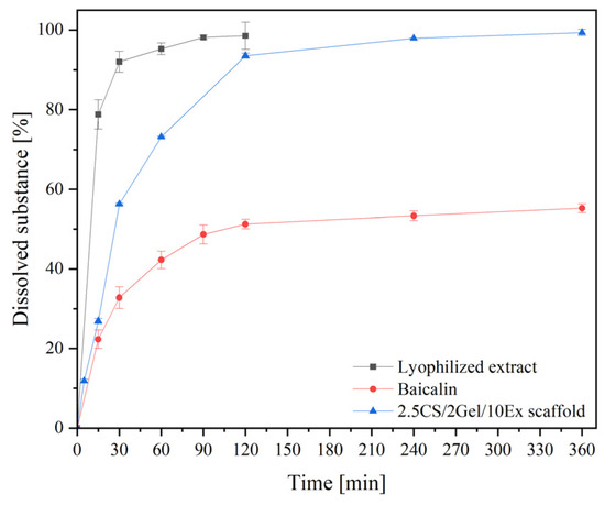 Next, dissolution behavior of baicalin from the scaffold containing the lyophilized extract was examined (Figure 5). Due to the amorphization of baicalin via extract lyophilization, a significant increase in the release of baicalin in vitro was observed (black line for lyophilized extract vs. red line for crystalline baicalin). Concerning the release of the extract from the 3D-printed scaffolds (blue line), it seems that there is an optimization of its in vitro release behavior since the blends contribute to a release in a more controlled way. Furthermore, two phases can be noticed. An initial burst baicalin release during the first two hours is followed by a sustained release over 6 h.