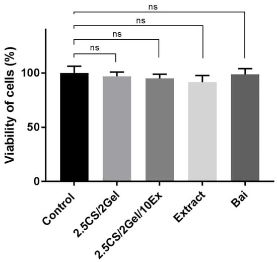Viability of human normal skin fibroblasts (Hs27 cells) incubated for 24 h with hydrogel base (2.5CS/2Gel), hydrogel-based scaffold (2.5CS/2Gel/10Ex), Scutellaria baicalensis extract (Extract), and baicalin (Bai). The samples were examined by MTT test at the concentrations used in the wound healing assay. Results were statistically analyzed by ANOVA with a post hoc Tukey’s test. ns—not significant (p > 0.05).