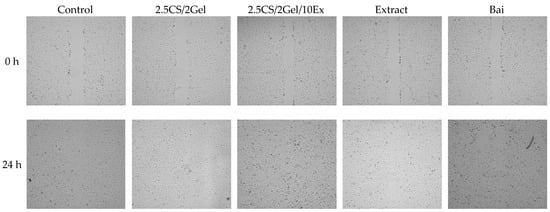 Using the scratch assay, the ability of hydrogel and its components to heal wounds was investigated on Hs27 cells. Human skin fibroblasts Hs27 (CRL-1634) were obtained from the American Type Culture Collection (Manassas, VA, USA). The cells were cultured in DMEM-high glucose supplemented with 10% FBS, penicillin (100 U/mL), and streptomycin (100 µg/mL). Prior to the experiment, the Hs27 cells were planted at a density of 1 × 105 cells/mL on 6-well culture plates (Corning Inc., Corning, NY, USA) after being separated using trypsin/EDTA. After the cell confluence approached 90%, a vertical linear scratch was formed in the monolayer with a sterile pipette tip. To eliminate any leftover cell debris, three rounds of washing with phosphate-buffered saline (PBS) were followed by the addition of a new medium containing hydrogel base (2.5CS/2Gel), hydrogel-based scaffold (2.5CS/2Gel/10Ex), Scutellaria baicalensis extract (Extract), baicalin (Bai), or 2% FBS only (control group) to the corresponding wells. After that, images of the scratch were taken at 0 h and 24 h using an Olympus CKX53 microscope equipped with an XM10 digital camera (Olympus). The experiments were run in triplicate. The open wound area was measured using NIH ImageJ software (Bethesda, Rockville, MD, USA) (https://imagej.net/nih-image/, accessed on 20 February 2024) and considered as 100% at the beginning of the experiment (at 0 h). The wound closure % was calculated using the following formula: