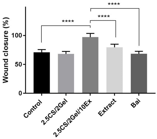 Wound healing activity observed after 24 h incubation of human normal skin fibroblasts (Hs27 cells) with hydrogel base (2.5CS/2Gel), hydrogel-based scaffold (2.5CS/2Gel/10Ex), Scutellaria baicalensis extract (Extract), and baicalin (Bai). Samples of 2.5CS/2Gel and 2.5CS/2Gel/10Ex were mixed with the culture medium to obtain 1% solution (0.1 mL of 2.5CS/2Gel or 2.5CS/2Gel/10Ex + 9.9 mL of medium). Concentration of Extract was adjusted to its content in 2.5CS/2Gel/10Ex, while Bai was tested at its concentration determined in Scutellaria baicalensis extract. Results were statistically analyzed by a one-way ANOVA with a post hoc Tukey’s test. Statistical significance was designated as **** when p < 0.0001.