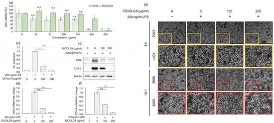 An MTT assay was performed to assess the toxicity of 70COL and 70COLGA prior to the experiments. While 70COL exhibited a cell viability of <80% at a concentration of 25 µg/mL, 70COLGA showed nearly 100% cell viability even at concentrations up to 200 µg/mL (Figure 2a). Therefore, it was confirmed that bioconversion to 70COLGA reduced the cytotoxicity of 70COL. As a cell viability < 80% is considered indicative of cytotoxicity, 70COL was excluded from subsequent experiments [29]. To confirm the anti-inflammatory effect of 70COLGA, RAW264.7 cells were stimulated with LPS, which is known to induce morphological changes in these cells [30]. We found that 70COGLA inhibited the LPS-induced morphological changes to RAW264.7 cells in a concentration-dependent manner (Figure 2b). In addition, 70COLGA significantly reduced LPS-induced inducible nitric oxide synthase (iNOS) and cyclooxygenase 2 (COX-2) levels, mRNA and protein expressions and nitric oxide (NO) production (Figure 2c–f). Taken together, these observations confirm that 70COLGA has an anti-inflammatory effect.