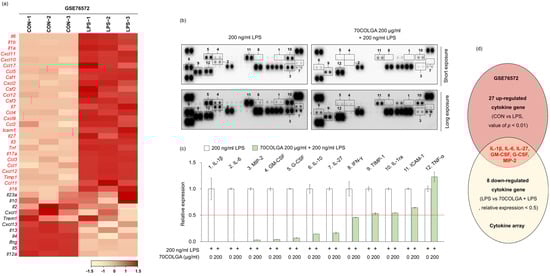 Next, we investigated whether 70COLGA showed anti-inflammatory effects through inhibition of other pro-inflammatory molecules in addition to IL-1β and IL-6. First, 27 genes upregulated in LPS-induced RAW264.7 cells were identified using the GSE76562 database (Figure 4a). Cytokine array analyses showed that IL-27, macrophage inflammatory protein (MIP)-2, granulocyte-macrophage colony-stimulating factor (GM-CSF) and granulocyte colony-stimulating factor (G-CSF) expressions were increased by LPS and decreased by 70COLGA (Figure 4b–d). GM-CSF is well known as a pro-inflammatory cytokine, and G-CSF regulates the cytokine response by inducing increases in the number and activation of immune cells [34,35]. In addition, IL-27 binds to the IL-27 receptor and activates JAK-STAT signaling in macrophages, and MIP-2 has been reported to be upregulated in the skin of patients with psoriasis, a chronic inflammatory skin disease [36,37]. Therefore, 70COLGA was suggested to exhibit anti-inflammatory effects by inhibiting pro-inflammatory molecules, such as IL-27, MIP-2, GM-CSF, and G-CSF, as well as IL-1β and IL-6.