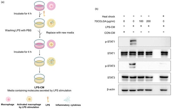 Pro-inflammatory cytokines are known activators, and we previously confirmed that 70COLGA inhibits STAT activation [38]. Since pro-inflammatory cytokines induce the activation of STAT, we investigated whether 70COLGA directly inhibits STAT activation rather than inhibits the expression of pro-inflammatory cytokines. First, an LPS-conditioned medium (LPS-CM) and the same amount of pro-inflammatory molecule medium, obtained from LPS-induced RAW264.7 cells, was collected and used to treat naïve RAW264.7 cells. Heat-inactivated LPS-CM was used as a negative control. When RAW264.7 cells were treated with LPS-CM, STAT was activated within 30 min, but this effect was suppressed by 70COLGA (Figure 5). These results suggest that 70COLGA not only inhibited the expression of proinflammatory molecules but also directly inhibited the activation of STAT in LPS-induced RAW264.7 cells.