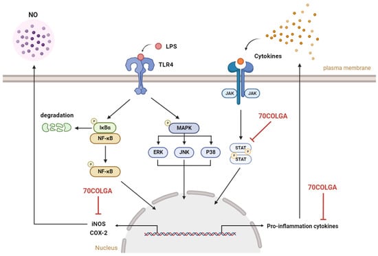 Graphical summary of this study. 70COLGA suppresses pro-inflammatory molecules. NO: nitric oxide, LPS: lipopolysaccharide, TLR4: Toll-like receptor 4, NF-κB: nuclear factor kappa-light-chain-enhancer of activated B cells, IκBα: inhibitory protein kappa B alpha, MAPK: mitogen-activated protein kinase, ERK: extracellular signal-regulated kinase, JNK: jun N-terminal kinase, JAK: janus kinase, STAT: signal transducers and activators of transcription, iNOS: inducible nitric oxide synthase, COX-2: cyclooxygenase 2, 70COLGA: Chamaecyparis obtusa (Siebold & Zucc.) Endl. leaf 70% EtOH extract fermented by Ganoderma applanatum. This summary figure was created using BioRender.com.