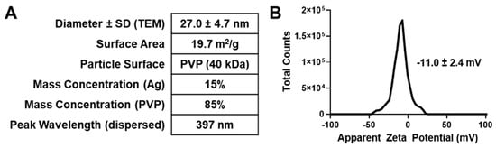 Physiochemical characterization of silver nanoparticles. (A) Silver nanoparticles (AgNPs) were purchased in the form of dried powder from Nanocomposix. Key physiochemical characteristics provided by manufacturer (Nanocomposix) are shown. (B) Zeta potential was measured with AgNPs dispersed in water at a concentration of 250 µg mL−1, and is shown ± SD as inset in graph.