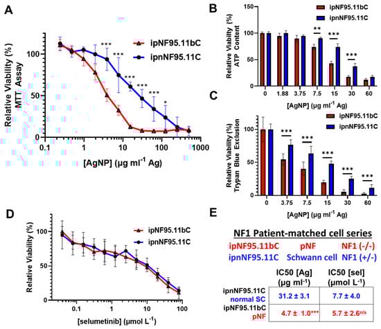 AgNP show preferential cytotoxicity in plexiform neurofibromas cells compared to NF1 patient-matched Schwann cells. NF1-associated plexiform neurofibroma cells (ipNF95.11bC) and patient-matched normal Schwann cells (ipnNF95.11C) were treated with AgNPs for 72 h, and viability was evaluated via (A) MTT viability assay, (B) ATP-based CellTiter Glo assay, and (C) trypan-blue exclusion. (D) Plexiform neurofibroma and patient-matched cells were treated with standard-of-care selumetinib for 72 h and viability evaluated via MTT assay; no significant difference exists between cell lines (E). Cell line NF1 status, and IC50 for AgNP and selumetinib derived from MTT assays is shown by μg mL−1 Ag, or μmol L−1 selumetinib ± SEM. MTT assay data represents four independent experiments per cell line each containing five technical replicates. Significance between IC50 and viability between cell lines was determined via Student’s t-test (* p < 0.05, ** p < 0.01, *** p < 0.005, n/s not significant).