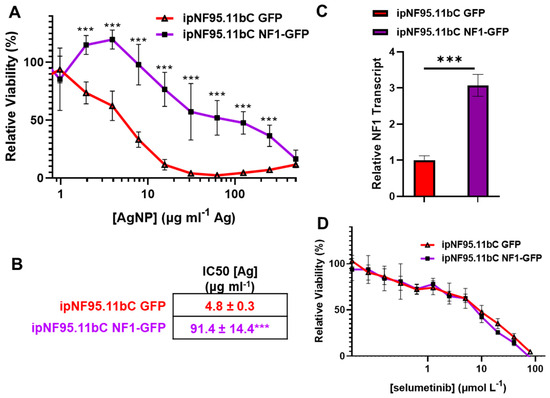 Neurofibromin is a negative regulator of Ras signaling. Loss of neurofibromin is known to increase reactive oxygen species and intracellular oxidative stress [29] which potentiates AgNP ionization/activation [21], and is a major driver in the development of plexiform neurofibroma. Biallelic loss of neurofibromin is a key difference between our plexiform neurofibroma cell model and the patient-matched Schwann cell control cell model. Since our previous study shows that functional neurofibromin expression has a direct effect on AgNP sensitivity in MPNSTs [18], we hypothesized that functional neurofibromin expression would also impact AgNP-mediated cytotoxicity in plexiform neurofibroma, as they are thought to ultimately transform into MPNSTs. To evaluate this hypothesis, we transduced our cell model of plexiform neurofibroma (ipNF95.11bC) cells with an expression vector containing functional neurofibromin tagged with green fluorescent protein, or an expression vector which contained green fluorescent protein to be used as control. Following puromycin selection, pooled clones of transfected cells (termed ipNF95.11bC-NF1-GFP and ipNF95.11bC-GFP) were treated with AgNP 0–500 μg mL−1 (by Ag content) for 72 h. The ipNF95.11bC-NF1-GFP cell line was significantly less susceptible to AgNP-mediated cytotoxicity relative to the control ipNF95.11bC-GFP, with IC50 values calculated to be 91.4 ± 14.4 μg mL−1 Ag and 4.8 ± 0.3 μg mL−1 Ag, respectively (Figure 4A,B). Levels of relative neurofibromin expression were determined using previously validated probes (Figure 4C). We then treated ipNF95.11bC-NF1-GFP and ipNF95.11bC-GFP with standard-of-care selumetinib and found there was no change in sensitivity to selumetinib (Figure 4D). These data support the direct link between functional neurofibromin expression and sensitivity to AgNP, whereas a direct link is not apparent between functional neurofibromin expression and sensitivity to selumetinib.