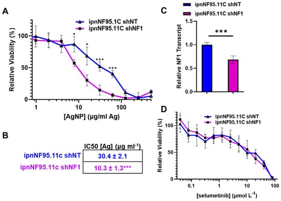 NF1 patients are much more susceptible to developing pNFs, as NF1 diagnosis itself requires a heterozygous neurofibromin pathogenic variant. Specifically, in NF1 patients, pNFs develop after complete loss of functional neurofibromin. Based on the finding that restoration of functional neurofibromin decreases sensitivity to AgNP, we sought to evaluate the consequence of loss of functional neurofibromin in NF1-patient-derived Schwann cells as it relates to AgNP-mediated cytotoxicity. Knockdown of neurofibromin was performed as detailed above and in [4], using ipnNF95.11C as a model of NF1-associated Schwann cells. We found that reducing expression of neurofibromin alone is sufficient to increase sensitivity to AgNP in NF1-patient-derived Schwann cells (Figure 5A), with IC50 values calculated to be 30.4 ± 2.1 μg mL−1 Ag for ipnNF95.11C—shNT and 10.3 ± 1.3 μg mL−1 Ag for ipnNF95.11C—shNF1. Knockdown of neurofibromin transcript was confirmed using quantitative PCR (Figure 5C). We then challenged ipnNF95.11C-shNF1 with standard-of-care selumetinib and found that decreased expression of neurofibromin did not affect sensitivity (Figure 5D). Our evidence further supports the correlation between functional neurofibromin expression and sensitivity to AgNP in pNFs and an in vitro model of tumor initiation.