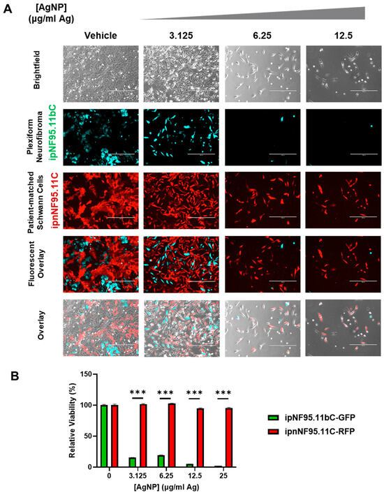 AgNP selectively removes plexiform neurofibroma cells from co-culture with patient-matched Schwann cells. Plexiform neurofibroma cells (ipNF95.11bC) and patient-matched control cells (ipnNF95.11C) were fluorescently labeled using lentiviral transduction, selected with puromycin, and clones were pooled. The ipNF95.11bC and ipNF95.11C were labeled as RFP and GFP, respectively. (A) ipnNF95.11bC-GFP and ipNF95.11C-RFP were seeded at a 1:1 ratio and treated with AgNP (0–12.5 μg mL−1 Ag) for 48 h. Representative images are shown after continuous treatment with AgNP. (B) ipnNF95.11C-RFP and ipNF95.11bC-GFP were grown under the same conditions as (A) as monocultures and treated with AgNP (0–25.0 μg mL−1) for 48 h, and viability assessed via MTT assay. Data is representative of three independent experiments each containing four technical replicates. Significance between cell lines was determined via Student’s t-test (*** p < 0.005).