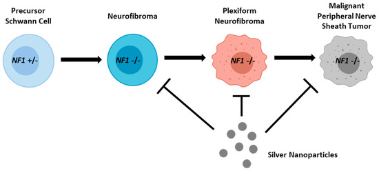 Early intervention is crucial for successful treatment of cancer, and clinical management of pNF is no different. Plexiform neurofibroma develops from Schwann cells after biallelic loss of neurofibromin, which is considered one of the “first-hits” during oncogenesis [33]. Therefore, AgNPs are in the unique position to treat not only established pNF, but also to eradicate theoretical pNF “progenitor” cells that have undergone biallelic loss of NF1, but have not fully transformed. This is evidenced by our finding that simply reducing expression of neurofibromin is sufficient to sensitize both NF1-associated Schwann cells (Figure 5A), and Schwann cells that are wild-type for neurofibromin, to AgNP [18]. To the best of the author’s knowledge, there is no other therapy in preclinical development that has the potential to target these tumor progenitor cells prior to tumor establishment (Figure 7). Prevention of plexiform neurofibroma tumor establishment, which in turn would prevent malignant transformation, would be a major breakthrough and could ultimately alter the clinical management of NF1 patients.