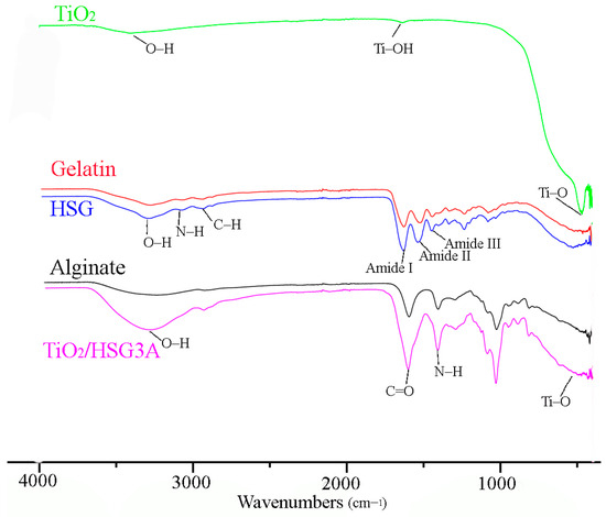 FTIR spectra of pure TiO2, gelatin, alginate, and gelatin-based hydrogel scaffolds HSG, and gelatin-/alginate-based hydrogel scaffold reinforced with TiO2 nanoparticles TiO2/HSG3A.