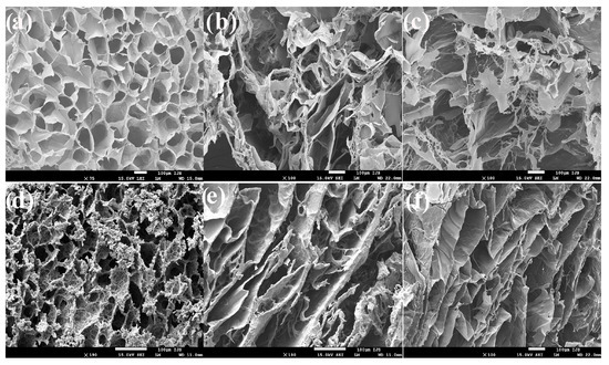 SEM micrographs of a cross-section of (a) HSG, (b) HSGA, (c) HG3A, (d) TiO2/HSG, (e) TiO2/HSGA, and (f) TiO2/HSG3A hydrogel scaffold.