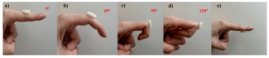 Adhesion of gelatin-/alginate-based hydrogel scaffold reinforced with TiO2 nanoparticles: photographs of (a) finger extended at 0° with the scaffold attached, (b) finger flexed to 45° with the scaffold attached, (c) finger flexed to 90° with the scaffold attached, (d) finger flexed to 120° with the scaffold attached, (e) the scaffold reverse attached to the palm side of finger.