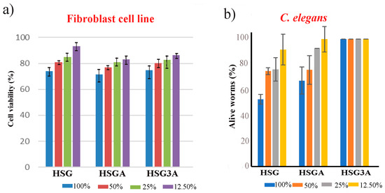 (a) MRC5 cell viability in the presence of 12.50%, 25%, 50%, and 100% v/v of extracts of HSG, HSGA, and HSG3A scaffolds. (b) Nematodotoxicity of 12.50%, 25%, 50%, and 100% v/v of extracts of HSG, HSGA, and HSG3A scaffolds.