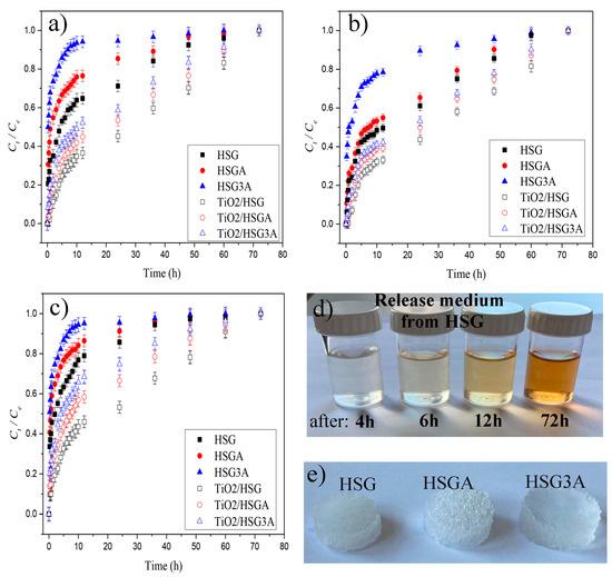 Release profiles of (a) caffeic acid, (b) allantoin, and (c) quercetin from the gelatin-/alginate-based hydrogel scaffolds and gelatin-/alginate-based hydrogel scaffolds reinforced with TiO2 nanoparticles; (d) photographs of the release medium after 4 h, 6 h, 12 h, and 72 h of release from the HSG hydrogel scaffold; (e) photographs of HSG, HSGA, and HSG3A hydrogel scaffolds after release of the bioactive agents.