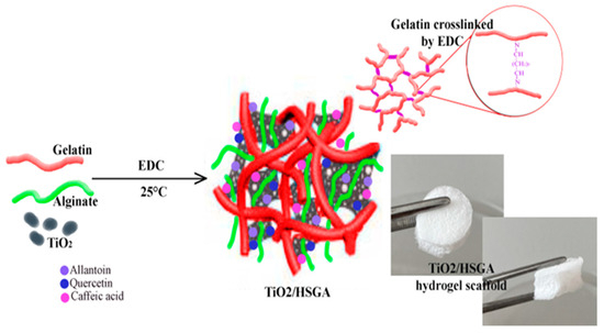 Synthesis route for the hydrogel scaffolds based on gelatin, alginate, active agents, and TiO2 nanoparticles obtained by a crosslinking reaction (details: photographs of the sample).