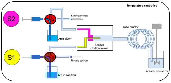 The tested microfluidic-based continuous crystallization system was SCT-LAB, obtained from Secoya Technologies (Louvain-la-Neuve, Belgium). In the SCT-LAB system, there were two sets of high-precision syringe pumps of 20 mL volume, one for the solvent line and one for the antisolvent line, that were connected through a microfluidic static mixing device (e.g., a co-flow mixer, a T-cross mixer, or a Y mixer) obtained from Secoya Technologies and connected to a 5 m long tubular reactor with a 0.5 mm inner diameter kept under thermostatic conditions, followed by a collection vessel. The whole setup was under a temperature control system, and the temperature was set at 25 °C. The generated suspensions were collected via an FEP outlet tube in an agitated crystallizer at 25 °C and kept under constant stirring at 800 rpm for 48 h before PSD analysis.