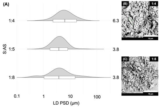 (A) Effect of solvent-to-antisolvent (S:AS) ratios on itraconazole (ITZ) particle size distribution (PSD), measured by laser diffraction (LD), in suspensions with solid loading of 10 mg/g (after 48 h of storage in an agitated crystallizer at 25 °C), generated via the Y mixer microchannel reactor-based continuous liquid antisolvent crystallization (MCR-CLASC) process. The violin plots orientated with horizontal density curves depict the whole PSDs. The results are presented in the overlaid box plots, where the medians correspond to the D50 values, the lower hinges correspond to the D10 values, the higher hinges correspond to the D90 values, and the whiskers correspond to the D1–D99 ranges. An increase in the S:AS ratio resulted in a gradual decrease in the median D50 value mentioned on the right and the length of the boxplot. Scanning electron microscopy (SEM) images of ITZ microparticles in the generated suspensions (after 48 h of storage in an agitated crystallizer at 25 °C) produced via Y mixer microchannel reactor-based continuous liquid antisolvent crystallization (MCR-CLASC) using S:AS ratios of (B) 1:4 and (C) 1:8, respectively.