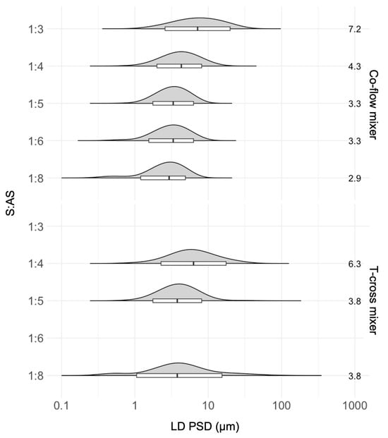 Effect of solvent-to-antisolvent (S:AS) ratios on the particle size distribution (PSD) of itraconazole (ITZ) in the generated suspensions (after 48 h of storage in an agitated crystallizer at 25 °C) via the Secoya microfluidic crystallization technology-based continuous liquid antisolvent crystallization (SCT-CLASC) process using comparisons between the co-flow mixer and the T-cross mixer, measured by laser diffraction (LD). The entire PSDs are shown in the violin plots that are orientated with horizontal density curves. The findings are displayed in the overlaid box plots, where the medians correspond to the D50 values, the lower hinges correspond to the D10 values, the higher hinges correspond to the D90 values, and the whiskers correspond to the D1–D99 ranges. The median D50 value for the S:AS ratio, shown on the right, decreases slightly as the ratio increases up to 1:4.