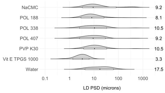 Following the optimization of the majority of the SCT-CLASC process operating variables, the optimal stabilizer concentration needed to stabilize ITZ crystals in suspension was determined. This was achieved by comparing the performance of various % w/w Vit E TPGS 1000 aqueous feed solutions as antisolvents to that of reference water without any stabilizer while using the co-flow mixer as a static mixer at a medium optimized S–AS flow rate of 5–20 mL/min. Other process variables remained constant, including the S:AS ratio of 1:4 and the 100 mg/g ITZ feed solution concentration, under storage in an agitated crystallizer for 48 h at 25 °C. The effect of reducing the Vit E TPGS 1000 concentration in the antisolvent on the PSDs of the produced suspensions is shown in Figure 7.