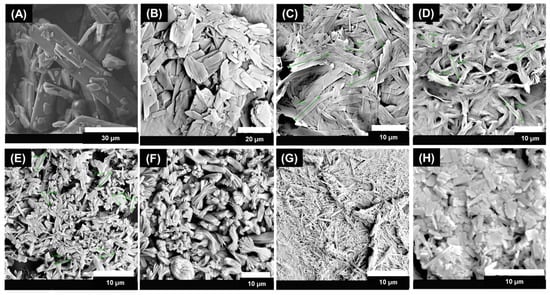 Scanning electron microscopy images of ITZ particles in suspensions with solid loading of 20 mg/g produced by the Secoya microfluidic crystallization technology-based continuous liquid antisolvent crystallization (SCT-CLASC) process using six water-soluble stabilizers in water, used as the antisolvent, compared to (A) ITZ as received and (B) reference water after 48 h of storage in an agitated crystallizer at 25 °C: (C) Poloxamer 188, (D) Poloxamer 338, (E) Poloxamer 407, (F) PVP K30, (G) Na CMC, and (H) Vitamin E TPGS. Green lines in the picture indicate measured particles size.
