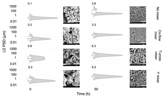 Figure 6 (time: 10 min) shows that nanoparticles were formed in each case for ITZ, independently of whether no mixing device or a static mixing device was used. The D50 values for the initial ITZ nuclei were 0.1 ± 0.2, 0.2 ± 0.8, 0.3 ± 1.0, and 0.6 ± 1.2 µm, while the D90 values were 0.5 ± 0.2, 0.8 ± 0.3, 1.6 ± 0.6, and 3.5 ± 0.9 µm, when the mixer condition was changed from no mixer to the co-flow, T-cross, and Y mixer conditions, respectively. The PSD obtained with no mixer appears to have the narrowest distribution, while the PSD obtained with the T-cross mixer appears to have the widest distribution, probably due to rapid agglomeration just after mixing. After 48 h, it can be observed that all four suspensions were in the micron size range. The D50 values of the aged ITZ particles increased, these being 3.8 ± 1.2, 3.3 ± 0.5, 6.3 ± 0.5, and 6.3 ± 0.7 µm, while the D90 values were 493 ± 26.7, 6.6 ± 0.4, 12.5 ± 0.5, and 17.6 ± 0.3 µm, when the mixer condition was changed from no mixer to the co-flow, T-cross, and Y mixer conditions, respectively. Figure 6 (time: 48 h) shows that when the T-cross and Y mixers were employed, the PSDs were broader and shifted to a higher value than when the co-flow mixer was used. Furthermore, the PSD obtained with no mixer displayed the widest multimodal distribution, with an additional peak in the 100–1000 µm size range due to agglomeration and uncontrolled crystal growth []. This observation contributes towards confirmation of the hypothesis presented before, namely, that the PSD was primarily controlled by Vit E TPGS 1000.
