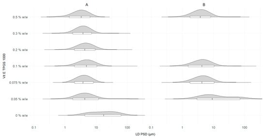 Effect of different Vit E TPGS 1000 concentrations in terms of ITZ particle size distribution (PSD) in the generated suspensions with solid loading of 20 mg/g (after 48 h of storage in an agitated crystallizer at 25 °C) via the Secoya microfluidic crystallization technology-based continuous liquid antisolvent crystallization (SCT-CLASC) process using a co-flow mixer (A) at the optimized S–AS flow rate of 5–20 mL/min and (B) at the highest S–AS flow rate of 10–40 mL/min, measured by laser diffraction (LD).