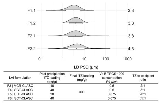 To investigate the stability of the four optimized post-precipitation suspensions (F1.1: suspension with a solid loading of 20 mg/g, Vit E TPGS 1000 0.5% w/w; F1.2: suspension with a solid loading of 20 mg/g, Vit E TPGS 1000 0.075% w/w; F2.1: suspension with a solid loading of 40 mg/g, Vit E TPGS 1000 0.5% w/w; F2.2: suspension with a solid loading of 40 mg/g, Vit E TPGS 1000 0.075% w/w) generated by the SCT-CLASC process and four subsequent LAI microsuspensions over time, samples were stored in unstirred conditions in sealed glass vials in controlled stability chambers at 25 °C for 4 months. The physical stability of the suspensions was measured in terms of resuspend ability. After this period, there should not be any sediment at the bottom of the vial after 30 s of swirling. In addition, PSD and crystallinity (determined by PXRD) were assessed for all optimized suspensions (both feed and LAI suspensions) after ensuring the homogeneity of the suspensions.