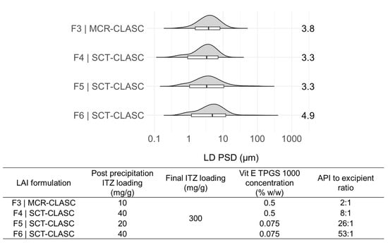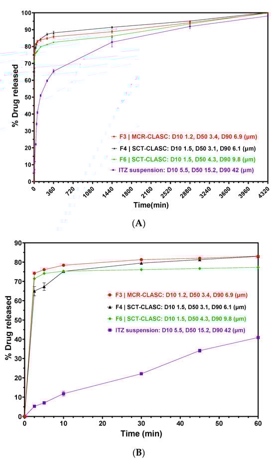 The dissolution profiles of three optimized stable ITZ LAI suspensions, i.e., the ITZ LAI suspension denoted F3|MCR-CLASC (PSD: D10 1.2, D50 3.4, and D90 6.9 µm), generated via downstream processing from a post-precipitation suspension loading of 10 mg/g after the MCR-CLASC process, with Vit E TPGS 0.5% w/w as a stabilizer; the ITZ LAI suspension denoted F4|SCT-CLASC (PSD: D10 1.5, D50 3.1, and D90 6.1 µm), generated via downstream processing from post-precipitation suspension loading of 40 mg/g after the SCT-CLASC process, with Vit E TPGS 1000 0.5 % w/w as a stabilizer; and the ITZ LAI suspension denoted F6|SCT-CLASC (PSD: D10 1.5, D50 4.1, and D90 9.8 µm), generated via downstream processing from a post-precipitation suspension loading of 40 mg/g after the SCT-CLASC process, with Vit E TPGS 0.075% w/w as a stabilizer, were evaluated and compared against the dissolution profile of the ITZ suspension, which comprised the as-received API suspension (PSD: D10 5.5, D50 15.2, and D90 42 µm) in Vit E TPGS 1000 0.5% w/w medium.