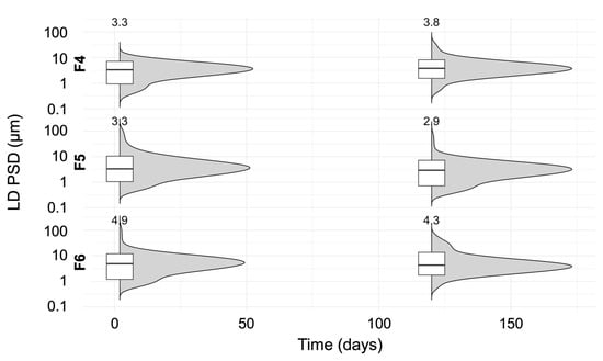 Impact of six water-soluble stabilizers (polymers and surfactants) on the ITZ particle size distribution (PSD) of the suspensions with a solid loading of 20 mg/g (after 48 h of storage at 25 °C in an agitated crystallizer) in comparison to reference water produced via the Secoya microfluidic crystallization technology-based continuous liquid antisolvent crystallization (SCT-CLASC) process using a co-flow mixer, measured by laser diffraction. The entire PSDs of ITZ are represented by the violin plots that are orientated with horizontal density curves. The overlaid box plots display the results, with the medians corresponding to the D50 values, the lower hinges corresponding to the D10 values, the higher hinges corresponding to the D90 values, and the whiskers corresponding to the D1–D99 ranges. The efficacy of the excipient in stabilizing the ITZ suspension increases with decreasing D50 values and box plot lengths, as indicated on the right.
