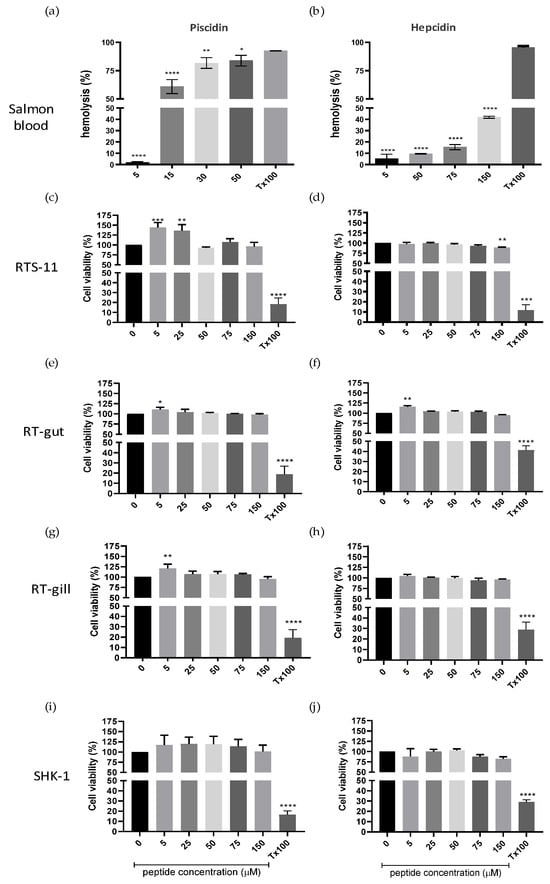 Cytotoxicity activity of piscidin and hepcidin in salmonid cells. Hemolytic activity was determined in salmon red blood cells at 5–50 µM concentration for piscidin (a) and 5–150 µM for hepcidin (b). PBS was used as a negative hemolytic control, while 0.5% Triton X-100 was used as a positive hemolytic activity. Cytotoxic effect of piscidin and hepcidin on RTS-11 cell line (c,d); RT-gut cell line (e,f); RTgill-W1 (g,h); and SHK-1 cell line (i,j). Cells were incubated for 24 h in the presence of different concentrations of piscidin and hepcidin (5–150 µM). Cell viability was measured using WST-1 assay. Data are expressed as mean ± SD of experiments performed in triplicate (* p = 0.0139; ** p = 0.0079; *** p < 0.005; **** p < 0.0001).
