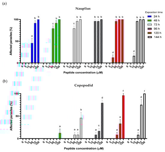 Antiparasitic activity of hepcidin against C. rogercresseyi. The graph shows the percentage of affected parasites against different concentrations of hepcidin (5–150 μM). Seawater was used as a negative control. The effect against nauplius (a) and copepodid (b) stages was evaluated between 24 and 144 h. Data are expressed as mean ± SD of experiments performed in triplicate. Significant differences are indicated with different letters with a p < 0.05 in each graph.