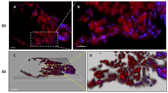 Location of hepcidin in C. rogercresseyi nauplius II. Fluorescence confocal microscopy analysis of the binding of hepcidin rhodamine labeled (red) at 150 μM to nauplius II stage. Parasite nuclei were stained with DAPI. The white and yellow segmented lines indicate the zoom zone images. (A) Single-plane fluorescence images captured from nauplius II stage at a magnification of 20×, with a measurement bar of 100 µm. (B) Magnified 40× single-plane fluorescence images depicting a closer view of the interaction between hepcidin and nauplius II, with a measurement bar of 50 µm. (C) Imaris 3D reconstruction of nauplius II at a magnification of 20×, with a measurement bar of 200 µm. (D) A 40× magnification of the 3D reconstruction illustrating the interaction between Hepcidin and nauplius II, with a measurement bar of 50 µm.