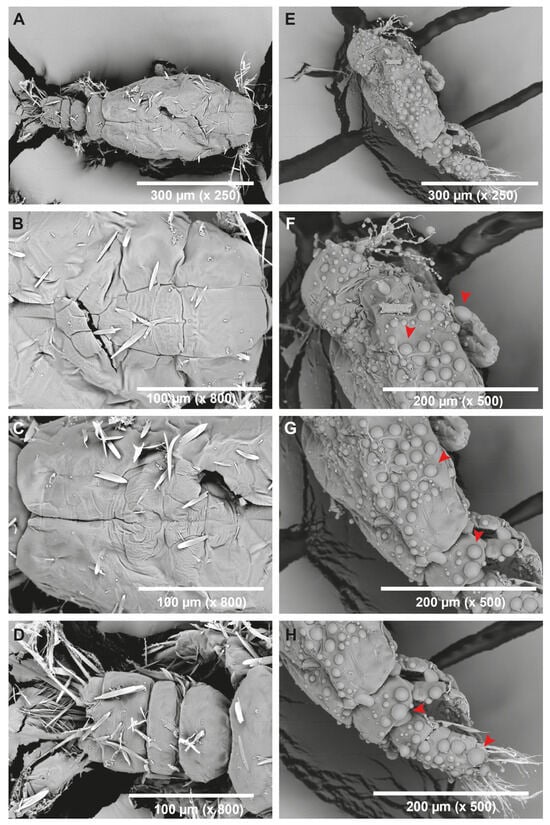 Surface damage of C. rogercresseyi nauplius by hepcidin. Scanning electron microscopy (SEM) micrographs of nauplius II. (A–D) correspond to micrographs of nauplius treated only with seawater. Micrographs (E–H) correspond to micrographs of nauplius treated with hepcidin at 75 µM. The red arrow indicates the presence of vesicle-like structures on nauplius II after treatment with hepcidin. The white bar at the bottom of each image indicates the size in µm.