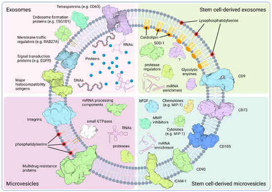 Schematic overview of the characteristic molecular constituents of standard extracellular vesicles and their stem cell-derived counterparts. Exosomes (top left quadrant), generally have their distinctive markers, like tetraspanins (e.g., CD63) and endosome formation proteins (e.g., TSG101 or ALIX), in their membranes. Intravesicularly, they have various protein and nucleic acid cargoes, whereas the former one often includes elements of the endosome genesis and endocytotic pathways. Among nucleic acids, exosomes are often loaded with various RNA components, like the tRNA or rRNA species, and DNA molecules, like the mitochondrial DNA. Standard microvesicles (bottom left quadrant), in contrast, are more enriched with components of the cell membrane and cytoplasm. For the former one, however, alterations compared to the parental cell plasma membrane, like the externalized phosphatidylserine, have been reported. Stem cell-derived exosomes (top right quadrant) show some unique features compared to standard exosomes, like the cardiolipin-enriched inner- and the lysophosphatidylserine-enriched outer leaflet of their membranes. It has also been reported that, among the thousands of cargo proteins identified, they carry enzymes, like the superoxide dismutase-1 (SOD-1) or protease activity regulators (e.g., SERPIN), which are indicative of their regenerative capacity. Their miRNA-enriched cargo together with enzymes influencing the target cells’ glucose metabolism (e.g., aldose reductases) or with uncharacterized functions (e.g., MAGIX) provides an explanation for their multiple effects observed. Stem cell-derived microvesicles (bottom right quadrant) also show some characteristic features compared to standard MVs, including the presence of stem cell-specific surface molecules (e.g., CD105 or CD90), and cargo enriched with growth factors (FGF2), chemokines (e.g., MIP-1), cytokines (e.g., IL-8), extracellular matrix remodeling regulators (e.g., MMP inhibitors), and miRNAs, highlighting the multipurpose physiologic roles of these EVs. Created with BioRender.com.