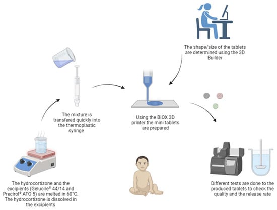 The methodology employed in crafting the 3D mini-tablets; created using BioRender.com https://www.biorender.com/ (accessed on 25 January 2024).