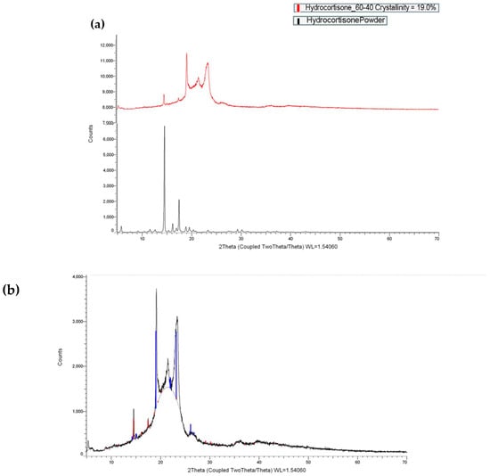 X-ray powder diffractograms of pure and printed drugs. (a) The formulation of 60/40 Gelucire® 44/14 to Precirol® ATO 5 with HCT. (b) Cumulative figure: the blue line depicts the small fraction of mono-, di- and triglycerides and mainly PEG-32 (MW 1500) which are present in Gelucire® 44/14.
