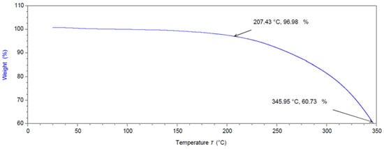 Thermal gravimetric analysis of HCT was performed using a TGA (Q5000 (Thermal Instruments, Moraine, OH, USA) to investigate the thermal stability of HCT. An aluminium pan, initially weighing 52.24 mg, was loaded with the sample, resulting in a total weight of 59.76 mg. This means that 7.52 mg of the drug was added. Measurements were taken within the temperature rate of 25 °C to 350 °C with a heating rate of 10 °C per minute.