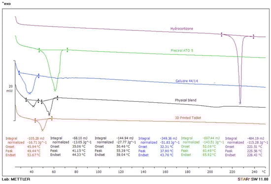 Furthermore, Figure 5 shows that for the physical mixture, a very weak and broad melting endotherm appears at around 207 °C for HCT. The temperature shift and broad shape suggest that HCT is highly miscible with the lipids, which, in turn, solubilise the drug. It can be seen that a small fraction of HCT remained crystalline due to the high drug loading []. On the contrary, for the 3D-printed mini-tablets, the HCT melting endotherm completely disappears while the two melting endotherms of Precirol® ATO 5 and Gelucire® 44/14 merge into one onset peak at 45.99 °C. This suggests that HCT was further transformed into an amorphous state because of the second thermal processing. However, as the temperature increased during the DSC run, the HCT was fully solubilized in the pan, and it was not possible to detect any remaining crystalline quantities. Nevertheless, the combined usage of X-ray and DSC analysis showed that HCT is partially crystalline within the 3D-printed mini-tablets.