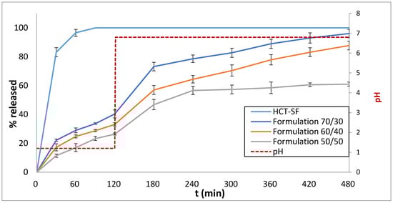 In vitro % release of HCT from 70/30, 60/40 and 50/50 formulations and the HCT-SF hydrocortisone tablets vs. time (min) at pH 1.2 (0–120 min) and at pH 6.8 (120–480 min). Results represent the mean value (n = 3, SD < 2).